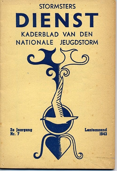 Tijdschrift "Stormsters Dienst. Kaderblad van den Nationale Jeugdstorm, 2e jaargang nr. 7, Lentemaand 1943". Op de voorkant staat het embleem van de Jeugdstorm: meeuw in een cirkel. Op de achterkant bevinden zich advertenties. De voorkant en achterkant zijn in marineblauw gedrukt, binnenkant zwarte druk.