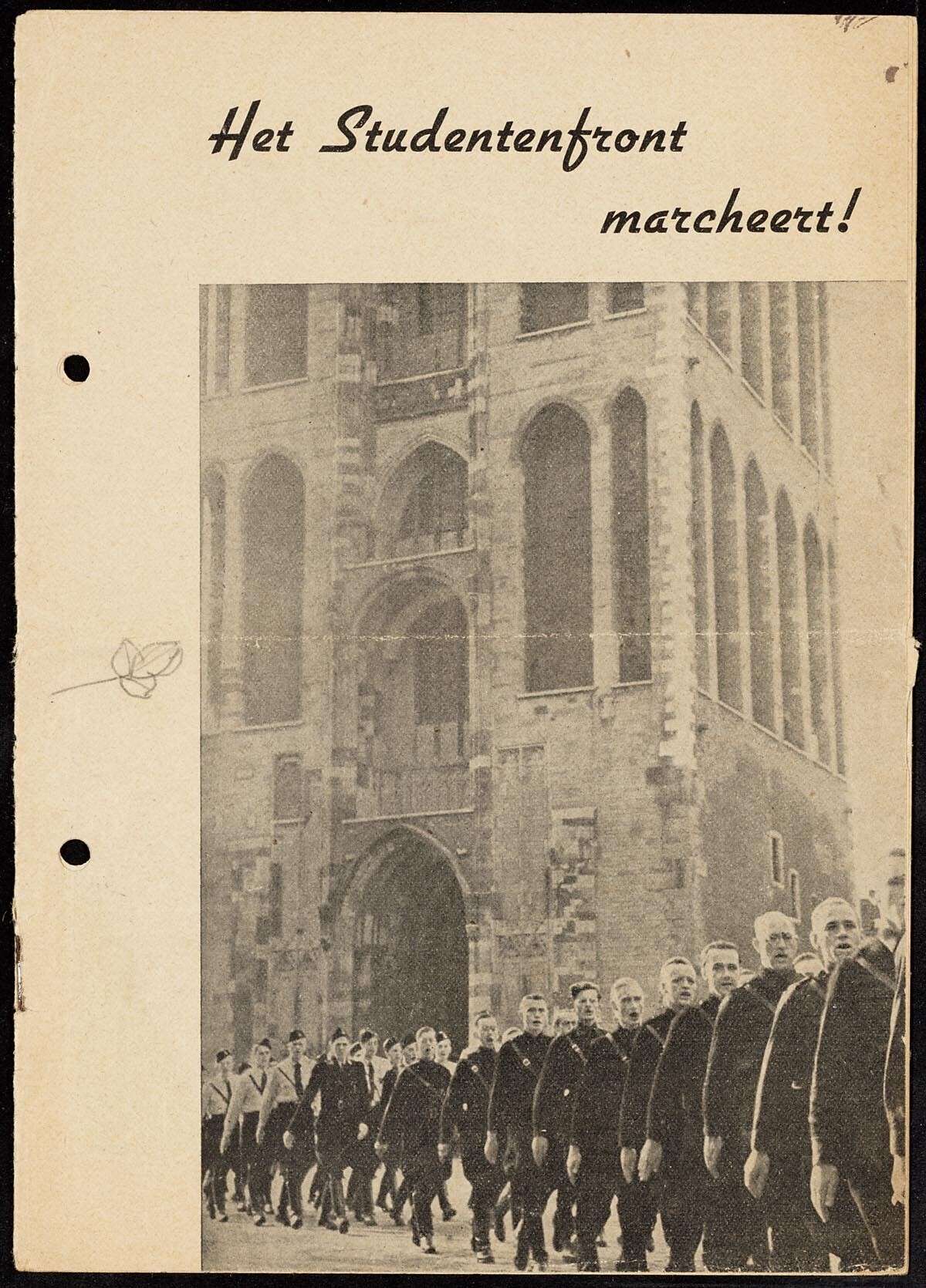 Een tijdschrift van het Studentenfront. Op de voorkant een zwartwit foto van marcherende mannen langs de domtoren in Utrecht en de titel ''Het Studentenfront marcheert''. Op de achterkant een formulier om informatie te verkrijgen over het Studentenfront of om lid te worden.