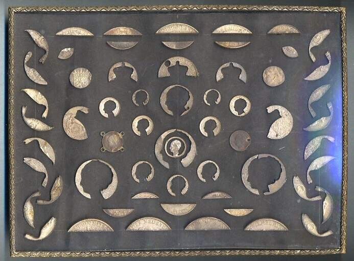 Een bewerkt zilverkleurig lijstje met glasplaat met daarin uitgezaagde portetten van koningin Wilhelmina uit verschillende soorten zilveren munten: dubbeltje, kwartje, gulden en rijksdaalder.
