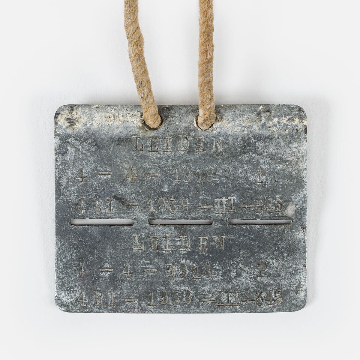 Een militair identiteitsplaatje van metaal aan een koord. Het plaatje bestaat uit twee delen met daarin dezelfde informatie geponst. Wanneer een soldaat gedood werd kan het onderste deel worden afgebroken en de gegeven verwerkt worden in de administratie. Het andere deel blijft bij de overledene. Op dit plaatje staat: "Nederland, Sanders, Abraham, Leiden, 4-4-1918 P, 4RI 1938 III 345".
