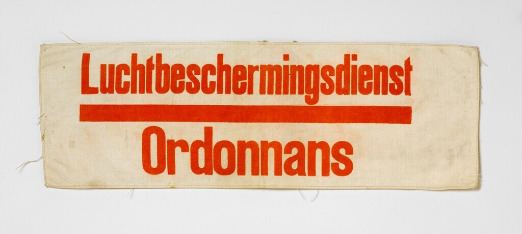 Een witte katoenen mouwband met oranje opdruk: 'Luchtbescherming - Ordonnans'.