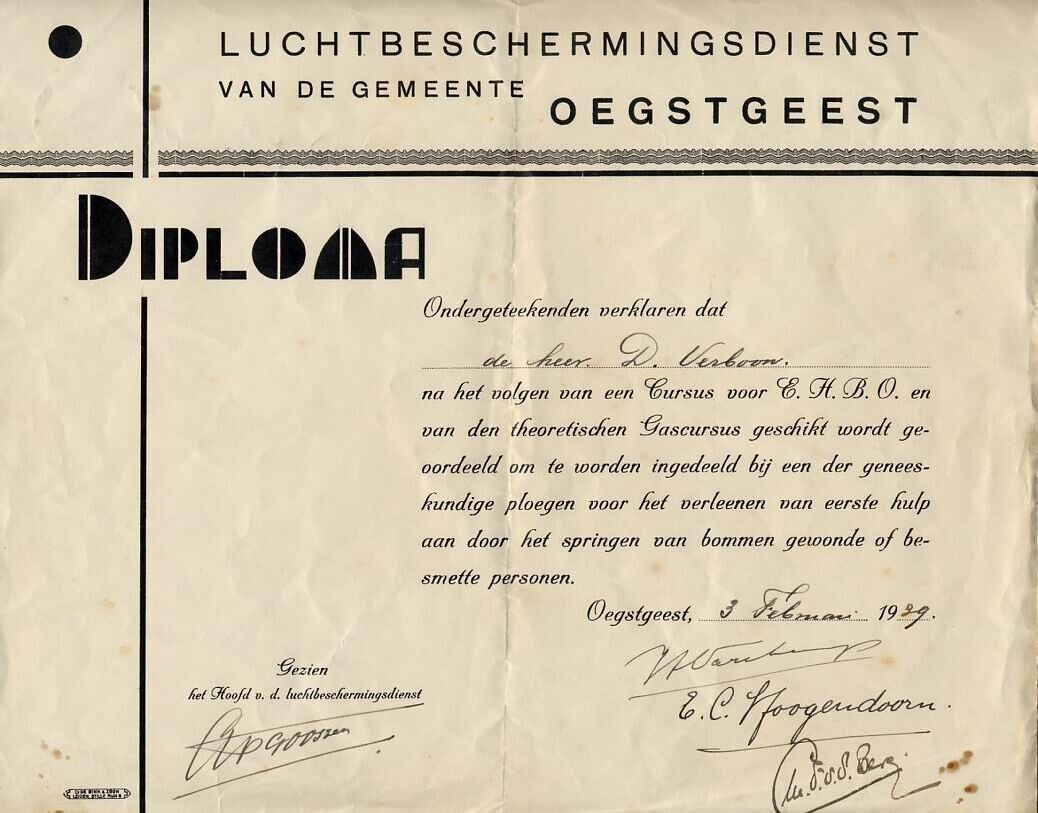 Diploma behaalt door de heer D. Verboon na het volgen van een cursus voor E.H.B.O. en "van den theoretische gascursus". Hij wordt daarmee geschikt geacht om te worden ingedeeld bij een van de geneeskundige ploegen voor het verlenen van eerste hulp aan "door het springen van bommen gewonde of besmette personen. Het diploma is afgegeven door de Luchtbeschermingsdienst van de gemeente Oegstgeest.