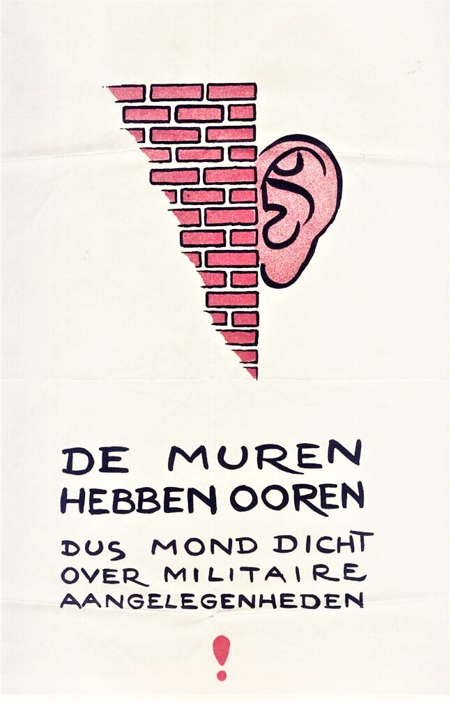 Wit affiche met in het midden een tekening van een stuk muur met daaraan een oor. Daaronder de tekst: "De muren hebben ooren, dus mond dicht over militaire aangelegenheden!"