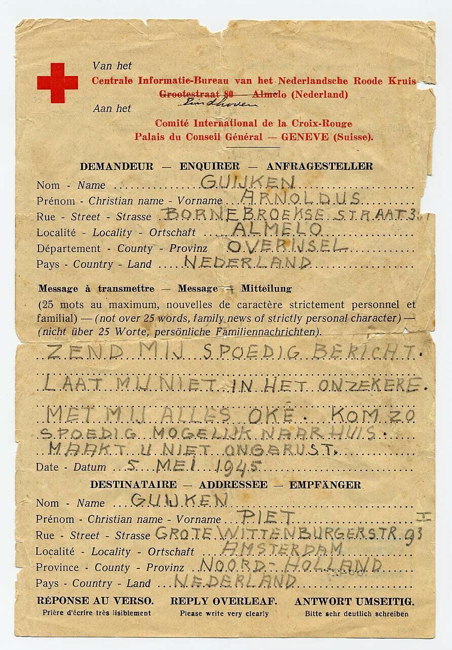Formulier van het Centrale Informatie-Bureau van het Nederlandsche Roode Kruis, met potlood ingevuld door A. Guijken te Almelo en gericht aan P. Guijken te Amsterdam. De handgeschreven tekst luidt: "Zend mij spoedig bericht. Laat mij niet in het onzekere. Met mij alles oké. Kom zo spoedig mogelijk naar huis. Maakt u niet ongerust. 5 mei 1945. Het antwoord op de achterkant luidt: "Bij ons alles in orde, allen zijn gezond. Hopen dat je gauw thuis komt. Je moeder en vader."