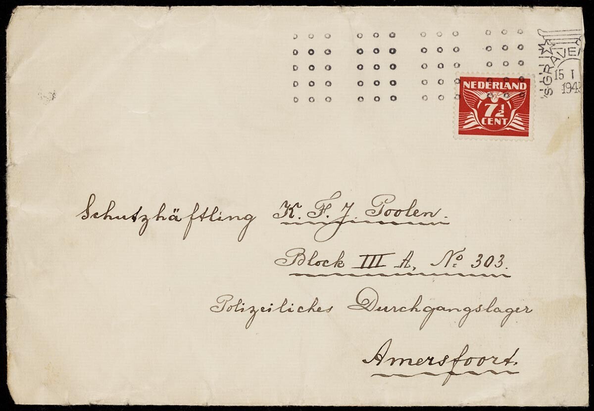 Vier enveloppen waarvan twee geschreven door mevr. E. Poolen en gericht aan K.F.J. Poolen in "Polizeiliches Durchgangslager Amersfoort" en twee van K.F.J. Poolen aan E. Poolen in Den Haag.