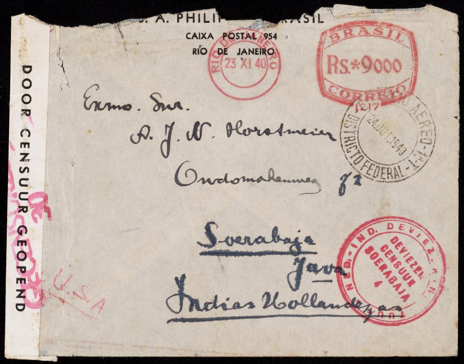 Een geopende enveloppe vanuit Brazilië aan A.J.W. Horstmeier te Soerabaja. Op de enveloppe o.a. een stempel van de deviezencensuur te Surabaya.