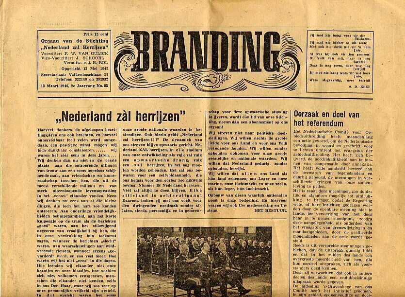 Uitgave van 'Branding' uitgegeven door de ''Stichting Nederland zal herrijzen''. Het centrale thema is annexatie van Duits grondgebied.