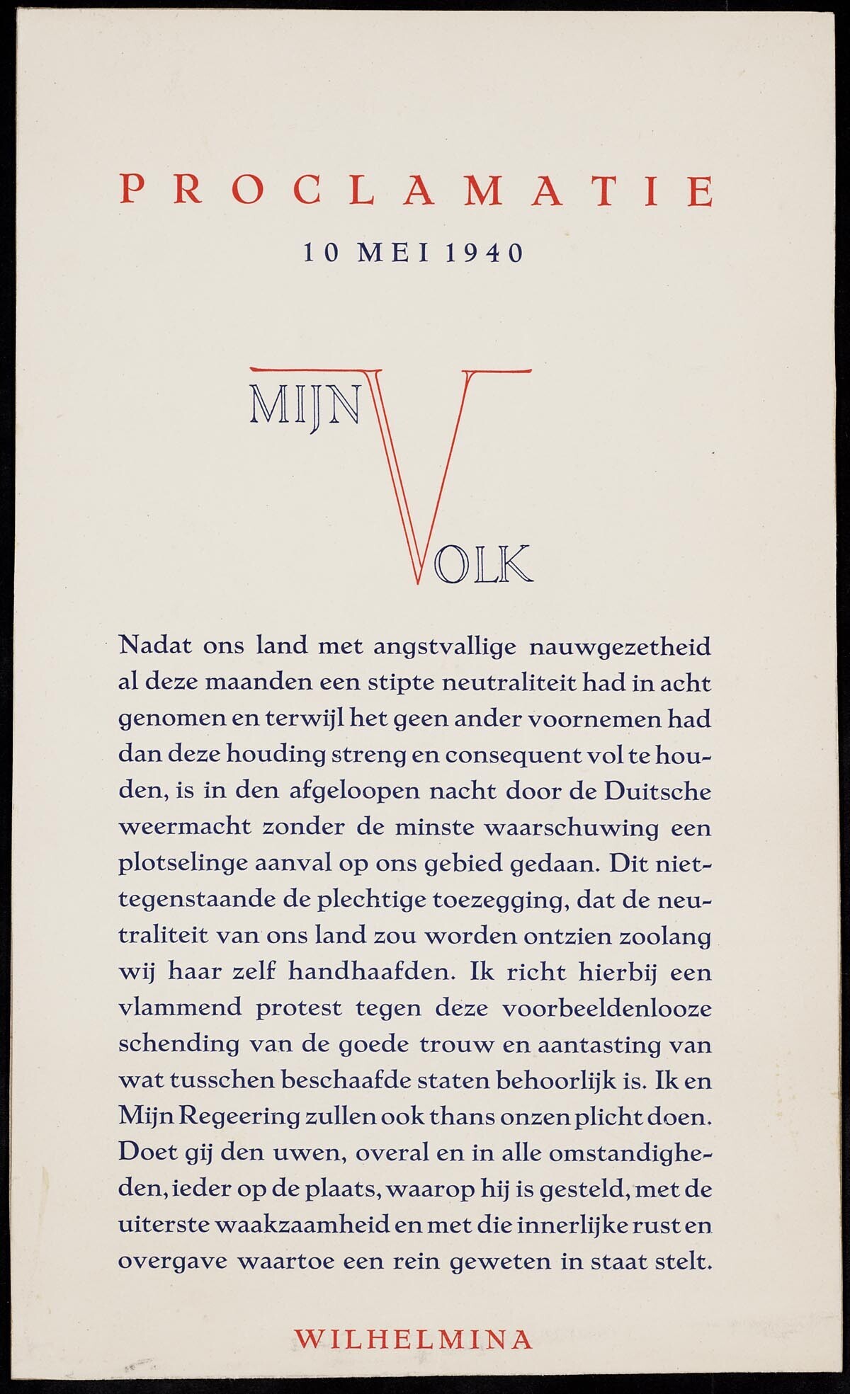 Proclamatie uitgesproken door koningin Wilhelmina op 10 mei 1940. In rood en blauw op wit papier gedrukt en opgeplakt op karton.