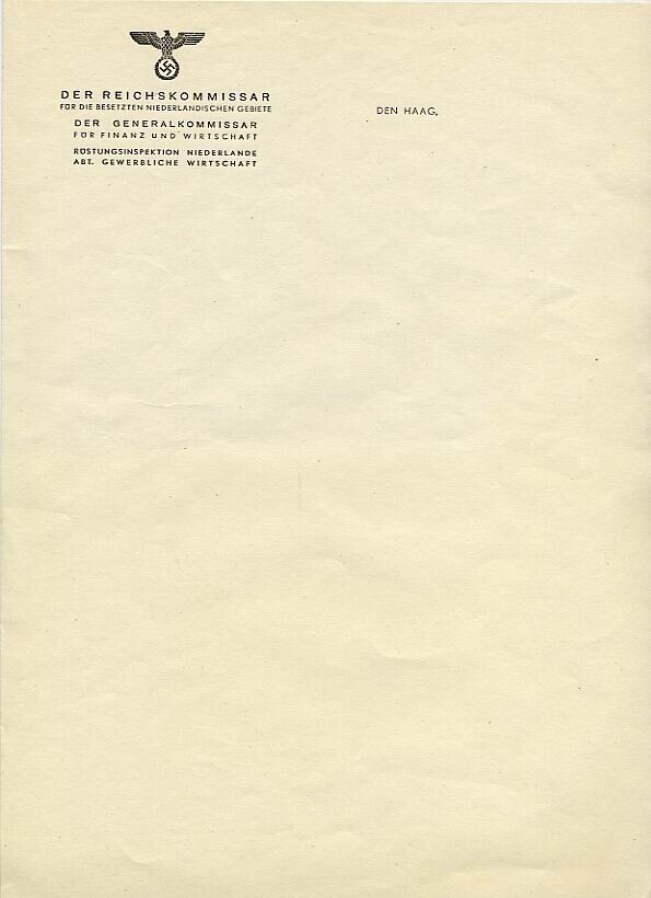 Diverse vellen van twee formaten blank briefpapier met briefhoofd ''Der Reichskommissar". Links bovenaan het briefpapier de Duitse rijksadelaar met het hakenrkuis in de klauwen. Dit briefpapier was van ''Der Generalkommissar für Finanz und Wirtschaft." Tevens een bruine enveloppe van ''Der Beauftragte des Reichskommissars'' met briefstempel.