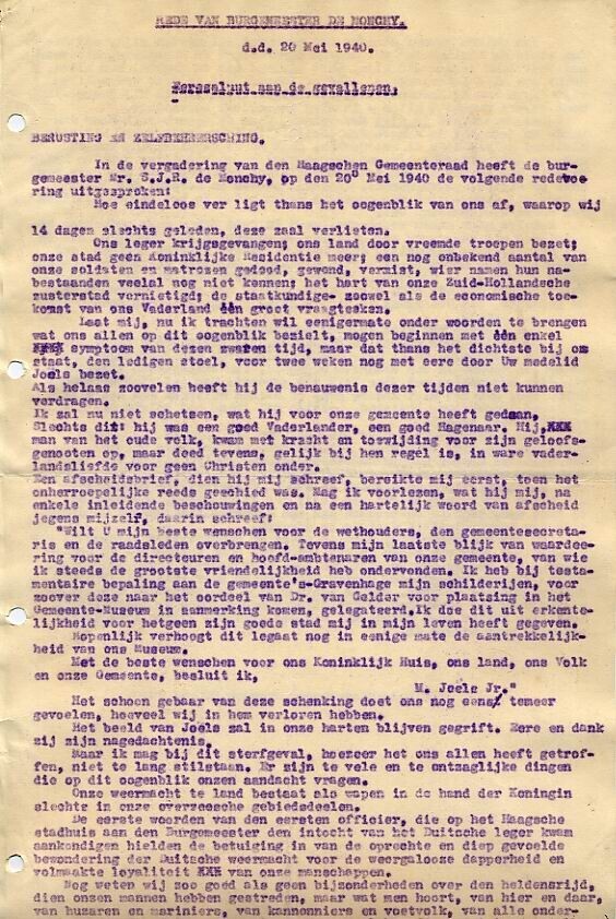 Een stencil de in paars gedrukte rede "Berusting en zelfbeheersching". Tijdens de Haagse Gemeenteraadsvergadering uitgesproken door Mr. S.J.R. de Monchy op 20 mei 1940. Het gaat om twee uitvoeringen. In deze redevoering herdenkt burgemeester de Monchy het Joodse gemeenteraadslid M. Joels Jr. die in mei 1940 na de Duitse inval, zelfmoord pleegde. In de redevoering wordt hierover vermeld: "Als zoovelen heeft hij de benauwenis dezer tijden niet kunnen verdragen." De burgemeester refereert aan de afscheidsbrief die hij van Joels heeft gekregen en prijst hem om zijn verdiensten. Genoemd wordt de testamentaire bepaling dat de schilderijen uit het bezit van Joels aan het Haags Gemeentemuseum worden geschonken. Naast deze herdenking wordt de strijd in de meidagen, de capitulatie na het bombardement op Rotterdam en het vertrek van koningin Wilhelmina beschreven.