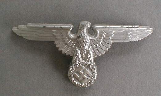 Een zilverkleurig metalen insigne van de Schutzstaffel in de vorm van de Duitse Rijksadelaar met gespreide vleugels en in de klauwen het hakenkruis. Op de achterkant drie bevestigingshaakjes.<br>