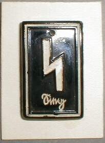Een rechthoekig zwart en wit geëmailleerd metalen hanger met de afbeelding van de Armanen Rune: 'S' in wit op een zwart veld. Onder het teken in wit: "Omy" (?).