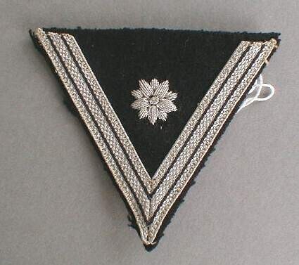 Een onderscheidingsteken van (vermoedelijk) een 'Oberrottenführer' van de SS in de vorm van een zwart vilten driehoek met langs twee randen drie zilveren banen en in het midden een zilveren ster. Op de achterkant van het embleem staat het merkteken: "A B No. 288838".<br><br>