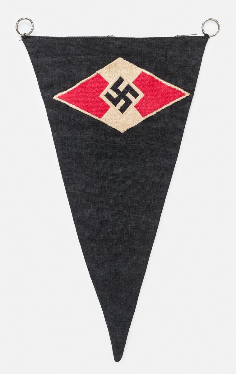 Een driehoekig zwart vaantje met twee metalen ringen. Op het vaantje is het ruitvormige symbool van de Bund Deutscher Mädel aangebracht: het hakenkruis op een rood en wit veld.