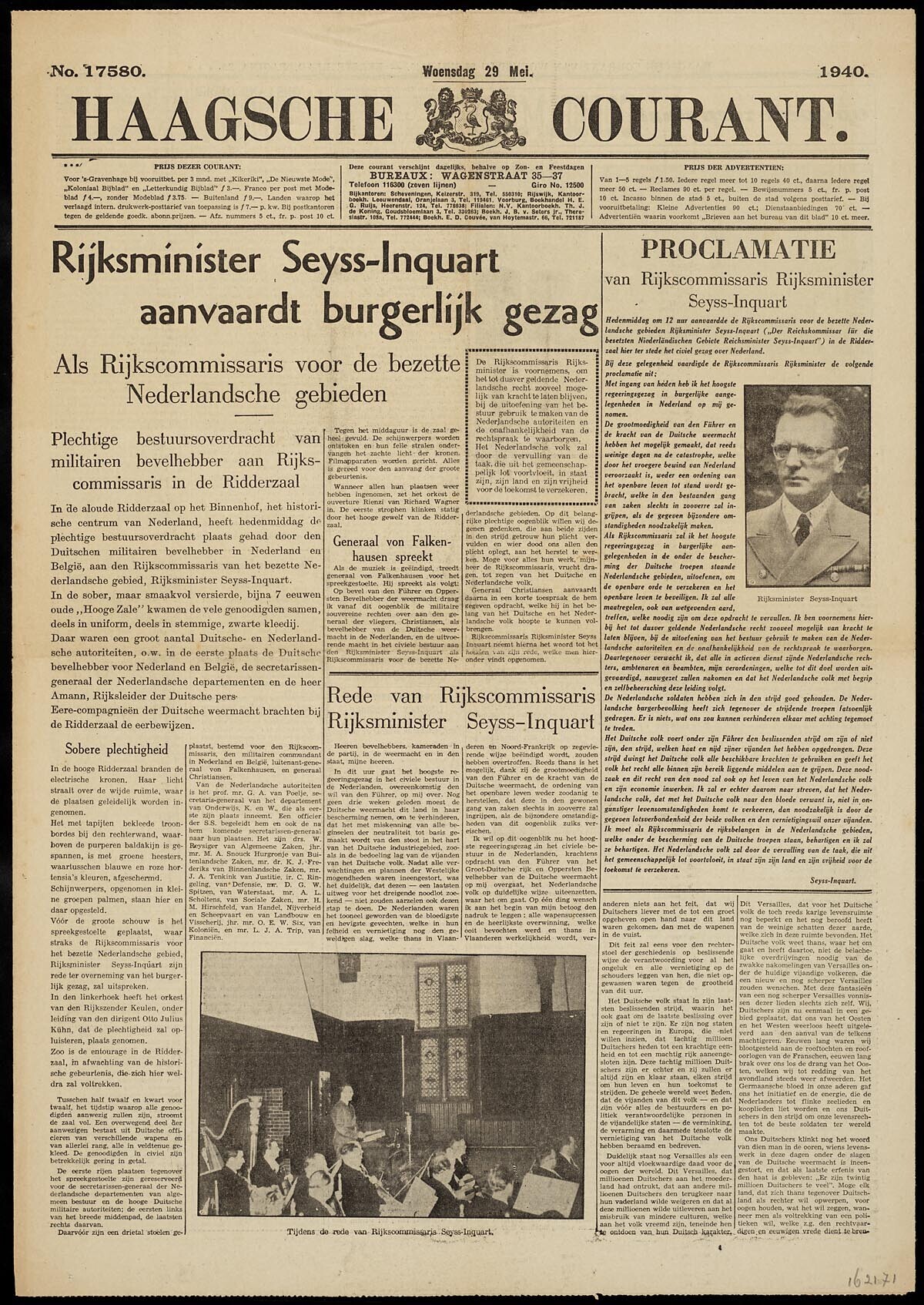 Een uitgave van het 'Haags dagblad' van dinsdag 29 mei 1940 no. 17580 met onder andere een artikel over de bestuursoverdracht aan Seyss-Inquart.