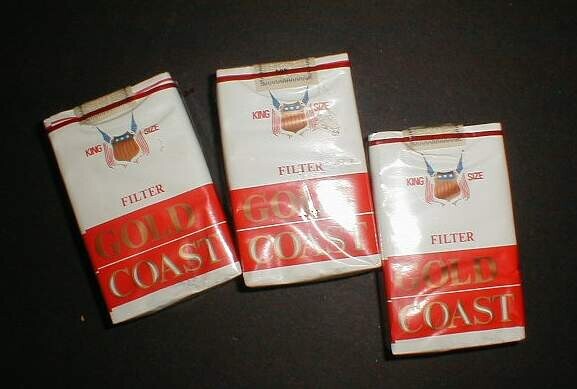 Drie onaangebroken pakjes 'Gold Coast Kingsize Filter 502' voor 20 sigaretten met voornamelijk witte, oranjerode en goudkleurige opdruk. Bovenaan in het midden het logo: een wapenschild geflankeerd door Amerikaanse vlaggen.