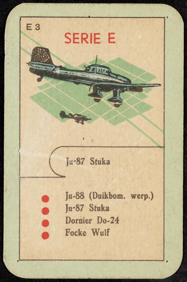 Een groene kartonnen speelkaart van een kwartetspel: E3, Serie E, Ju-87 Stüka.<br>
