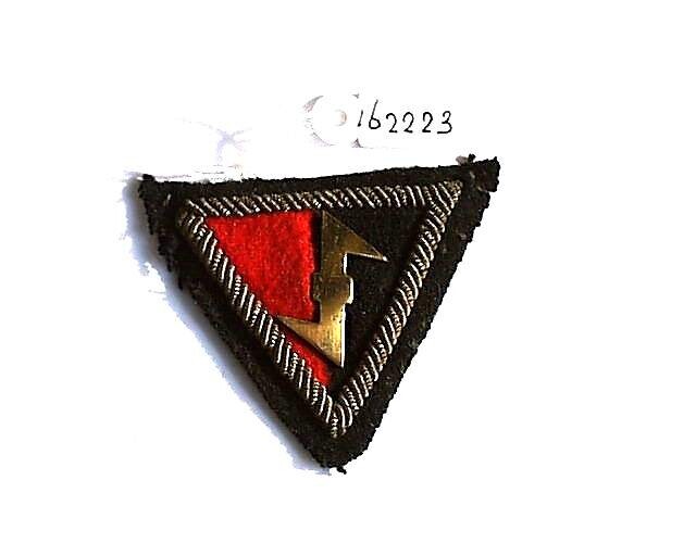 Een embleem gedragen door de Weerbaarheidsafdeling (W.A.) van de N.S.B.: een driehoekig embleem van rood en zwart vilt met binnen een driehoekig kader van gouddraad een koperkleurig metalen speldje in de vorm van een wolfsangel. Op de achterkant twee koperen pinnetjes.