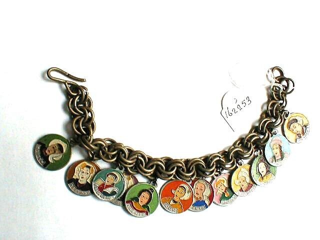 Een zilverkleurig metalen bedelarmband bestaande uit een dubbele rij ringen met hieraan twaalf ronde bedeltjes met de geëmailleerde voorstellingen van Nederlandse klederdrachten: Huizen, Zeeland, Spakenburg, Scheveningen, Drenthe, Urk, Twente, Friesland, Volendam, Hindelopen, Marken, Brabant.