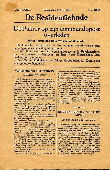 Een exemplaar van ''De Residentiebode". De exemplaren hebben als hoofdartikel: Strijd om Berlijn (28 april '45); voedseldroppings (30 april '45); Strijd om Berlijn (1 mei '45); Führer op zijn commandopost overleden (2 mei '45).