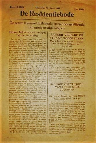 Een krant "De Residentiebode" van maandag 30 April 1945 met o.a. een artikel over: "De eerste levensmiddelenpakketten door geallieerde vliegtuigen afgeworpen".