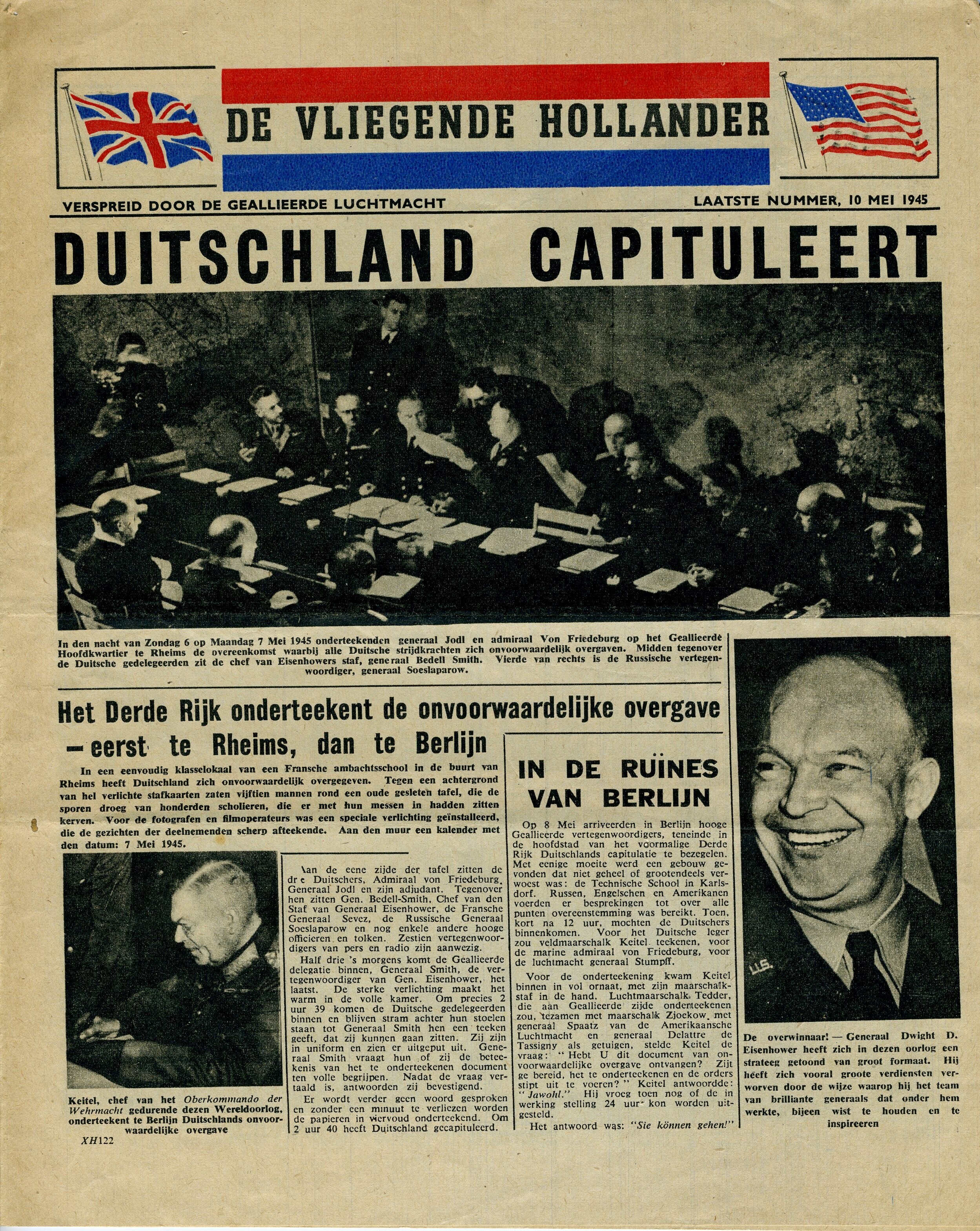 Vier exemplaren van de bevrijdingseditie van 10 mei 1945 van de verzetskrant ''De Vliegende Hollander''. Het betreft twee oorspronkelijke exemplaren en twee overdrukken van 5 mei 1970 door het Comité Bevrijdingsdag/Documentatiegroep '40-'45. Voorts een exemplaar van de Paaseditie met aandacht voor het bezoek van koningin Wilhelmina aan bevrijd gebied en de edtities 35 (8 juni 1944), 36 (15 juni 1944), 37 (22 juni 1944), 43 (3 augustus 1944) en 44 (10 augustus 1944). De oorspronkelijke krant werd verspreid door de geallieerde luchtmacht. In deze editie aandacht voor de val van Berlijn.