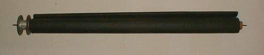Rol zwart verduisteringspapier op een houten rol met metalen katrol voor het verduisteren van een raam.