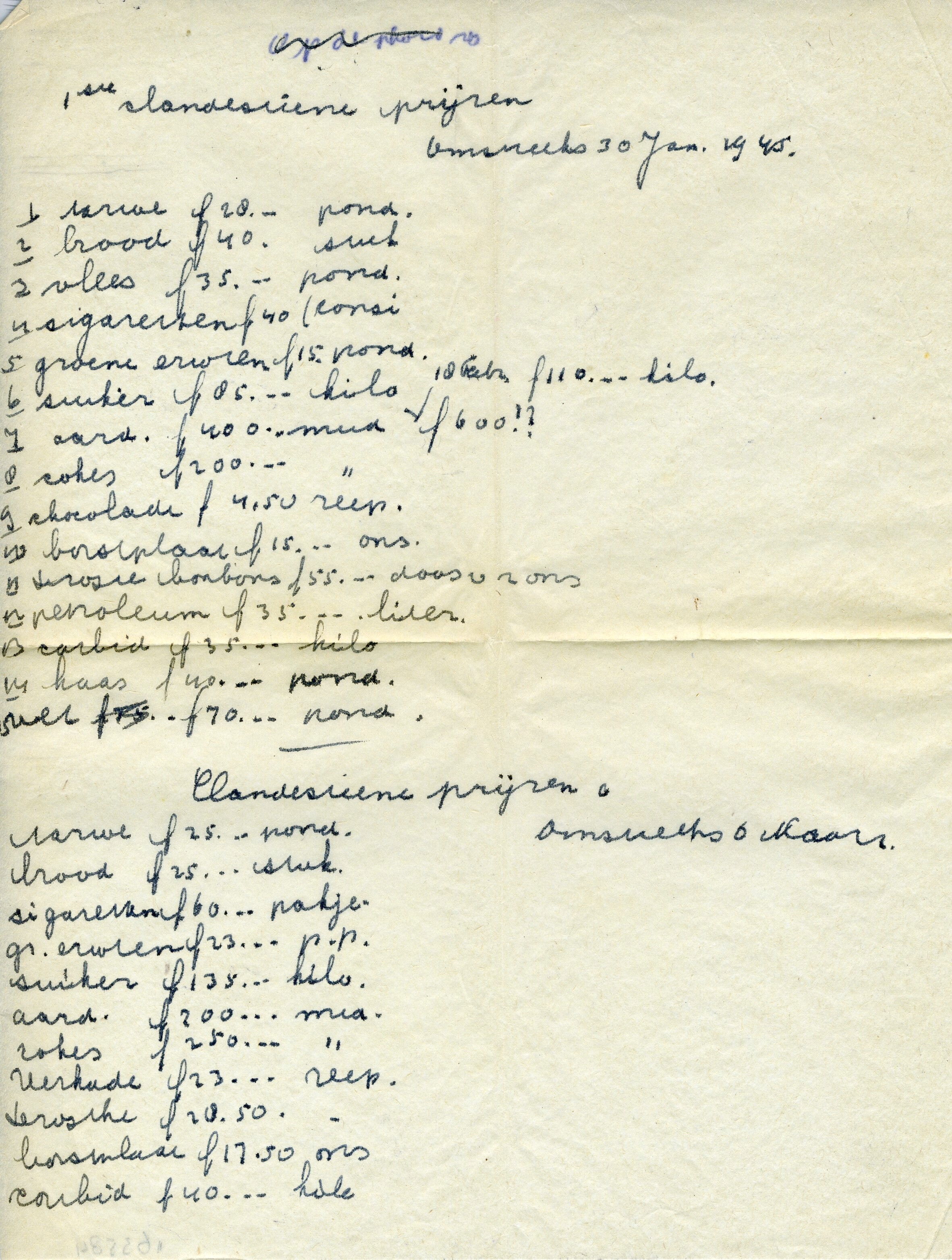 Handgeschreven lijst met een overzicht van clandestiene voedselprijzen.
