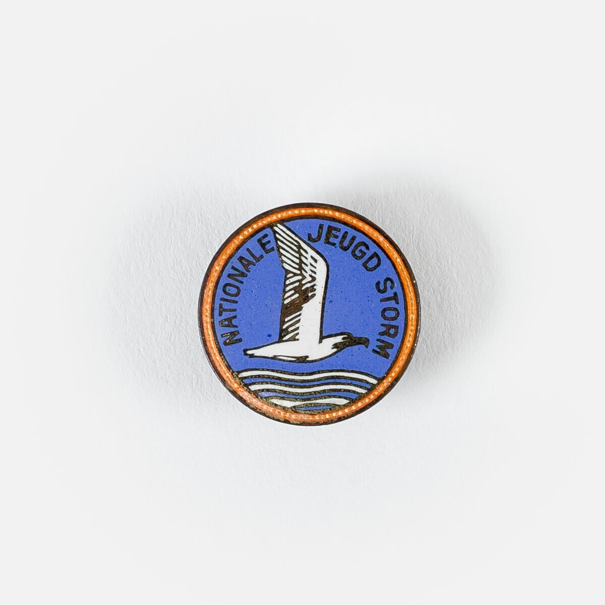 Een rond metalen speldje gedragen door leden van de Nationale Jeugdstorm met op een lichtblauw veld een vliegende stormmeeuw en profil van rechts gezien boven water. Om de meeuw: "Nationale Jeugdstorm". De speld heeft een oranje rand.