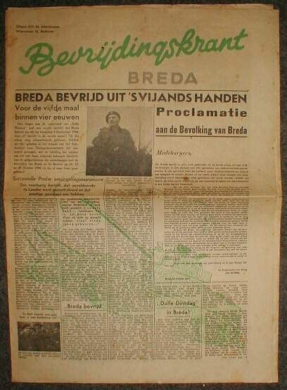 Een uitgave van de "Bevrijdingskrant Breda" met artikelen over de bevrijding door de geallieerde troepen op 29 oktober 1944, waaronder een proclamatie aan de bevolking van Breda.