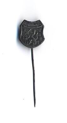 Een metalen speldje in de vorm van een wapenschild met de afbeelding van de klimmende Nederlandse leeuw met daarboven: "Nederland".