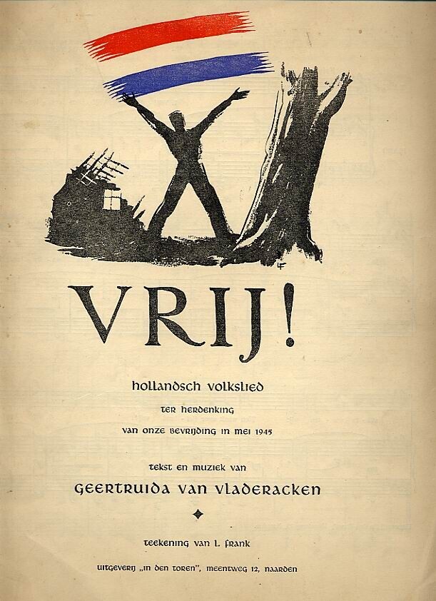 Lied ter gelegenheid van de bevrijding in mei 1945. Op het voorblad een zwartwit tekening van een juichende figuur tussen puinhopen onder een Nederlandse vlag.