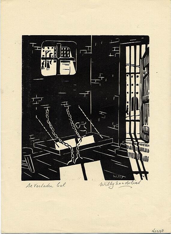 Gedicht "De verlaten cel" is gesigneerd met blauwe inkt door de schrijver M. Knoop. Het is gedrukt op wit papier. Op de dubbelgevouwen uitgave staat op de achterzijde een linosnede met een afbeelding van een verlaten cel van illustrator Willy Zandvliet. Het gedicht is uitgegeven in een beperkte oplage van 200 genummerde en gesigneerde exemplaren. Het betreft hier nummer 11.
