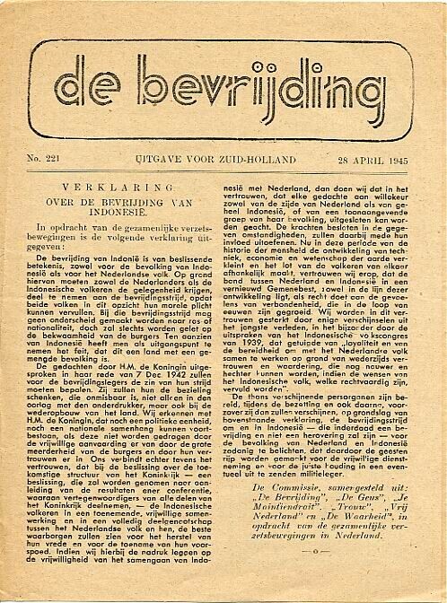 Editie nummer 221 van ''De Bevrijding''. Uitgave voor Zuid-Holland van 28 mei 1945, met een verklaring over de bevrijding van Indonesië" in opdracht van de gezamenlijke verzetsbeweging. De editie omvat vier pagina's.