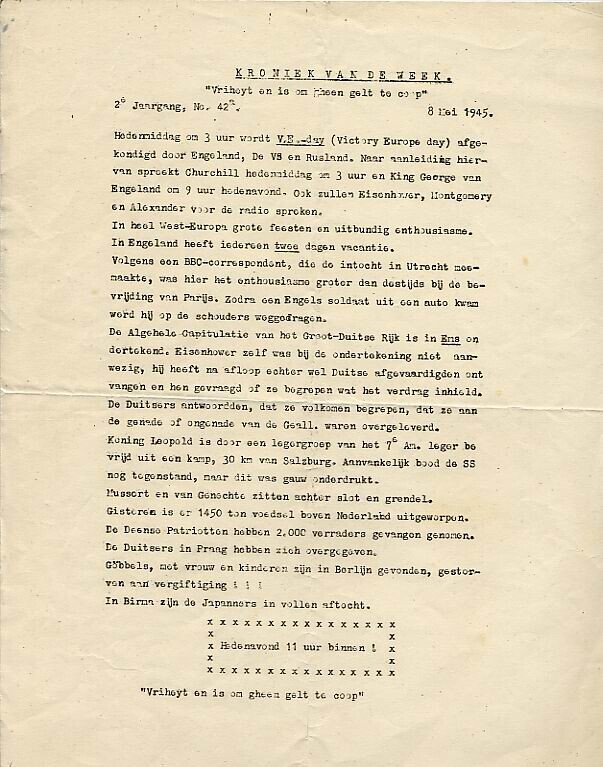 Editie van ''Kroniek van de week'', jaargang 2, nummer 42 van 8 mei 1945 over V.E.-day (Victory Europe Day) afgekondigd door Engeland, de Verenigde Staten en Rusland.