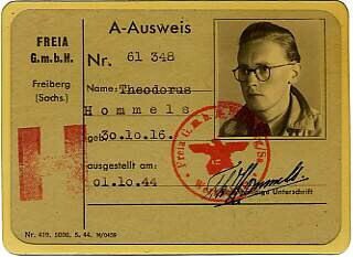In kunststof gevat Duitstalig identiteitsbewijs afgegeven door vliegtuigfabriek Freia G.m.b.H. te Freiburg op naam van Theodorus Hommels.