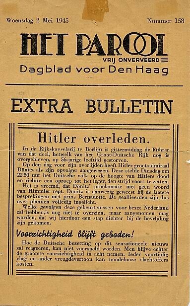 Een exemplaar van het dagblad 'het Parool' van woensdag 2 mei 1945.