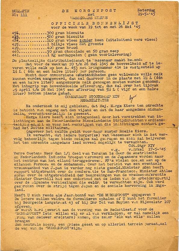 Editie nummer 111 van ''De Morgenpost'' van zaterdag 19 mei 1945 met onder andere de publicatie van de officiële bonnenlijst voor de week van 19 tot en met 26 mei 1945.<br>