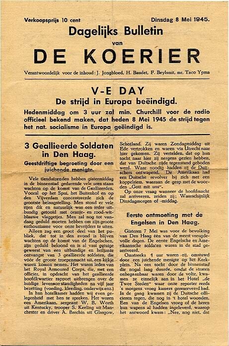 Dagelijks Bulletin van "De Koerier" van dinsdag 8 mei 1945, met als onderwerp het einde van de strijd in Europa en de arrestatie van Mussert.