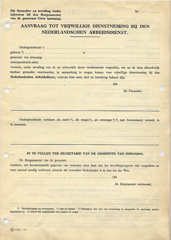 Aanvraag tot vrijwillige dienstneming bij den Nederlandschen Arbeidsdienst