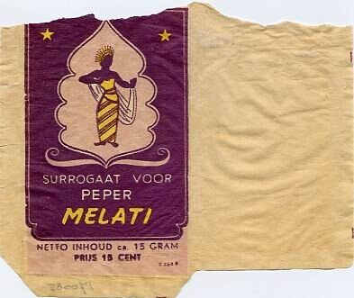 Verpakking van 15 gram Melati pepersurrogaat. Op het etiket een afbeelding van een Indonesische vrouwenfiguur.
