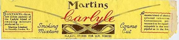 Geel verpakkingsmateriaal voor pijptabak. 'Martins Carlyle smoking mixture'', Matins Limited, London. Uit de "N.A.A.F.I. stores for H.M. Forces".<br>