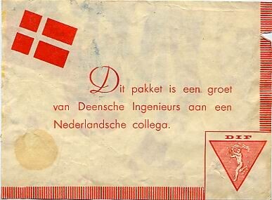 Deel van een verpakking waarop de tekst: Dit pakket is een groet van Deensche Ingenieurs aan een Nederlandsche collega. Rechts onderaan het logo DIF.<br>