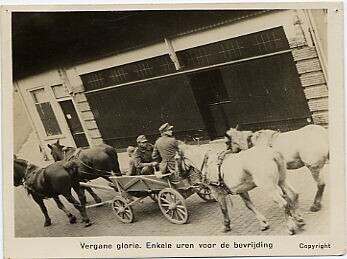 Een zwart-wit foto van drie Duitse soldaten in een open kar getrokken door twee zwarte paarden en achter de kar twee aangelijnde witte paarden. Het onderschrift luidt: ''Vergane glorie. Enkele uren voor de bevrijding.''