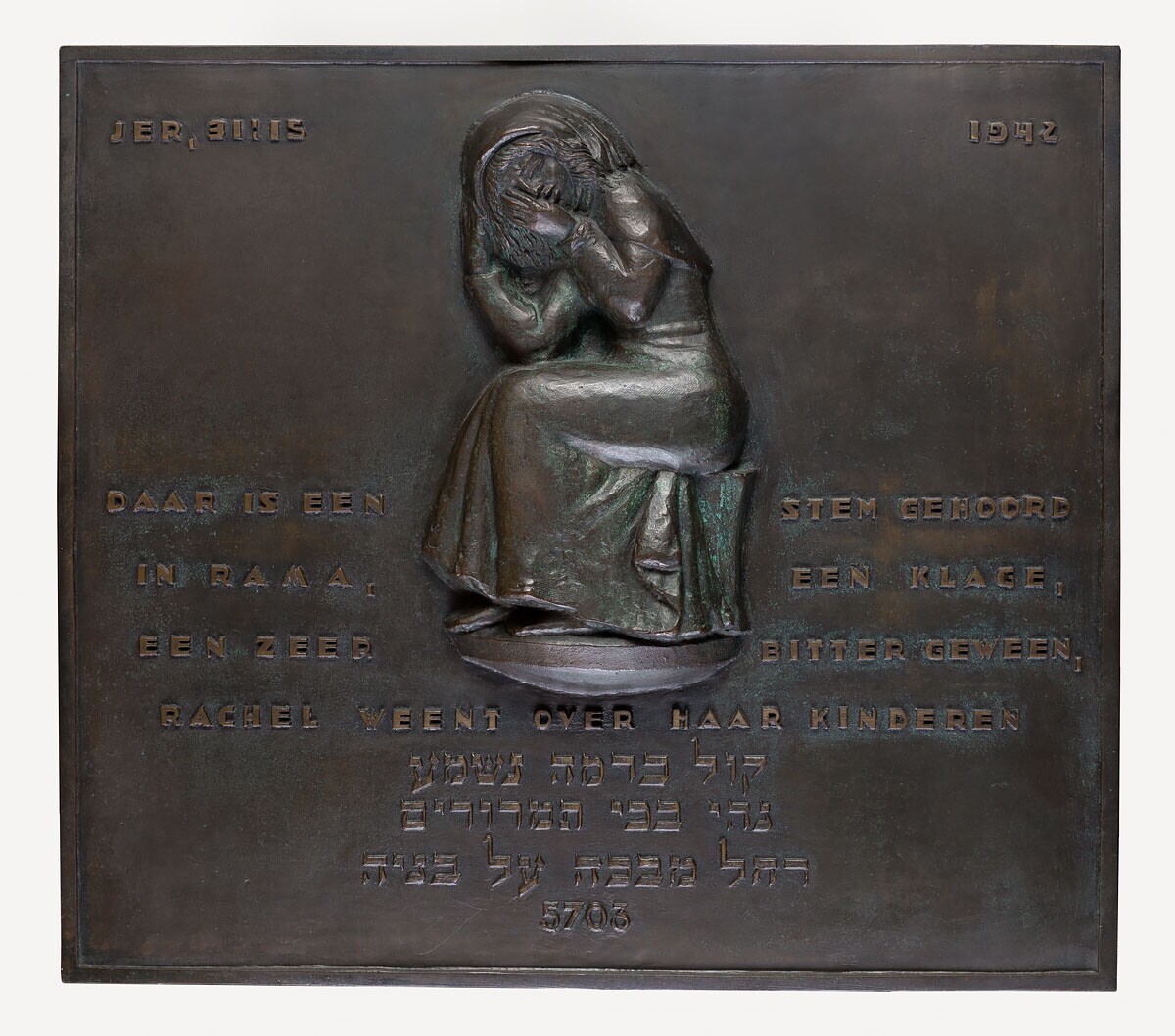 Een bronzen plaquette met in reliëf het jaartal 1942, de afbeelding van een zittende wenende vrouw in een lang gewaad en de tekst: "daar is een stem gehoord in Rama, een klage, een zeer bitter geween, Rachel weent over haar kinderen" en een tekst in het Hebreeuws 5703: Jom Hasjoa, de herdenking van de Sjoa (Holocaust) gerelateerd aan het jaar 1943 dat de Joden in het getto te Warschau in opstand kwamen. Deze plaquette herinnert aan het rampjaar 1942, waarin de joodse kinderen uit Den Haag werden weggevoerd. Het overgrote deel van de kinderen kwam nooit terug. Het ontwerp is van de Haagse beeldhouwer Theo van der Nahmer. Na de afbraak van de Joodse lagere school in de Bezemstraat in Den Haag is deze plaquette aan het Museon geschonken.
