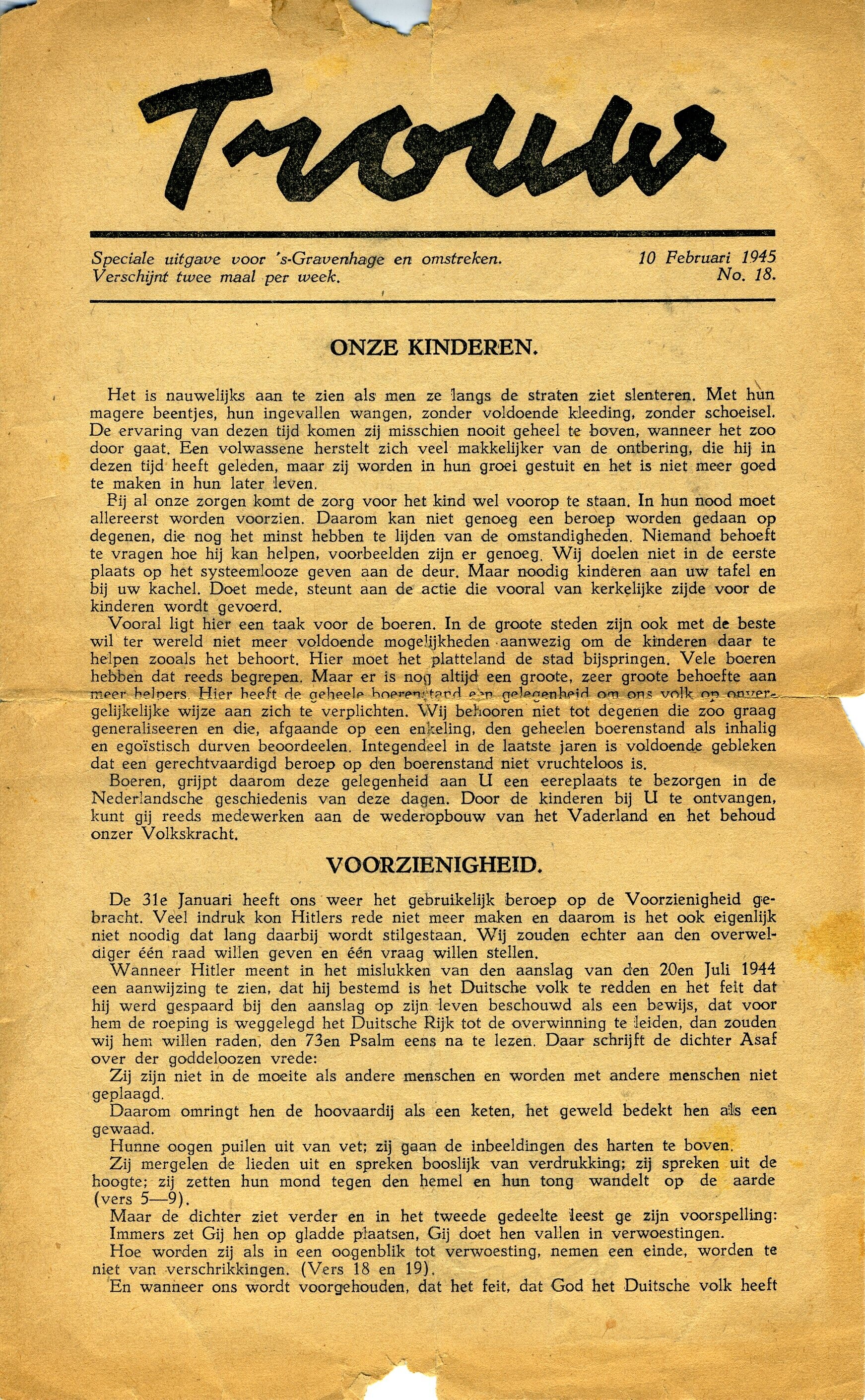 Speciale uitgave (no. 18) van het illegale krantje Trouw voor Den Haag en omstreken van 10 februari 1945.