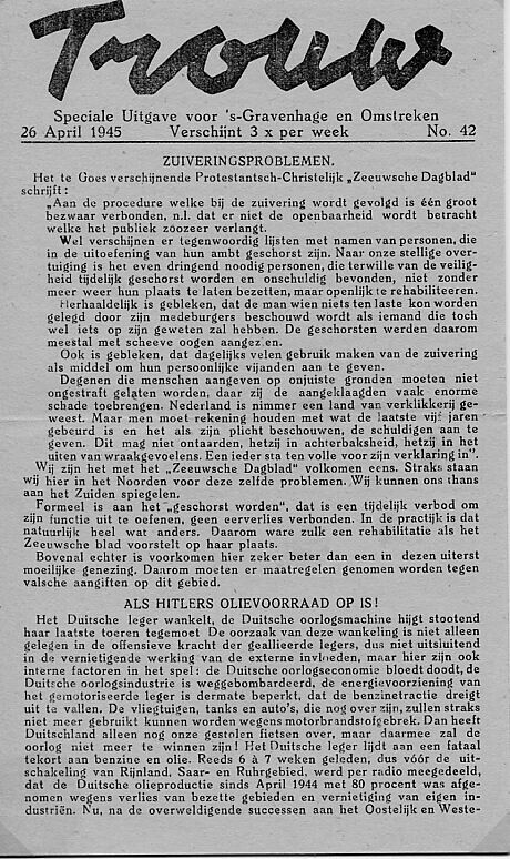 Twee exemplaren van de verzetskrant "Trouw". Het gaat om een "Speciale Uitgave voor 's-Gravenhage en Omstreken" van 26 april 1945.