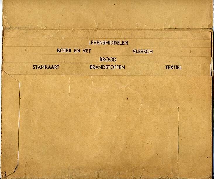 Lichtbruine map met overslag. De map heeft verschillende vakken voor onder andere: "Boter en Vet, Vleesch, Brood, Stamkaart, Brandstoffen, Textiel". In de map een gebruikte textielkaart uitgegeven in Voorburg.<br><br><br><br>