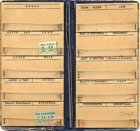 Zwart kartonnen map met donkerblauwe linnen rug en met donkerblauw geruit papier beplakt. De binnenkant is van lichtbruin karton met vakjes voor de bonnen gemaakt van plastic strips en daarboven de tekst voor het soort bon.<br>