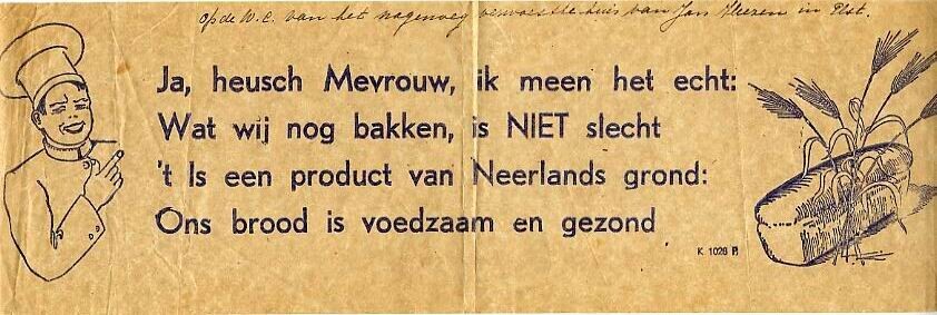 Reclamestrook waarop een tekening van een bakker en een brood met korenaren en een rijm over voedzaamheid van brood.